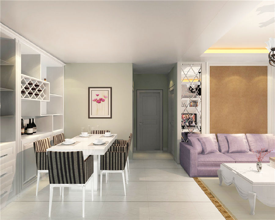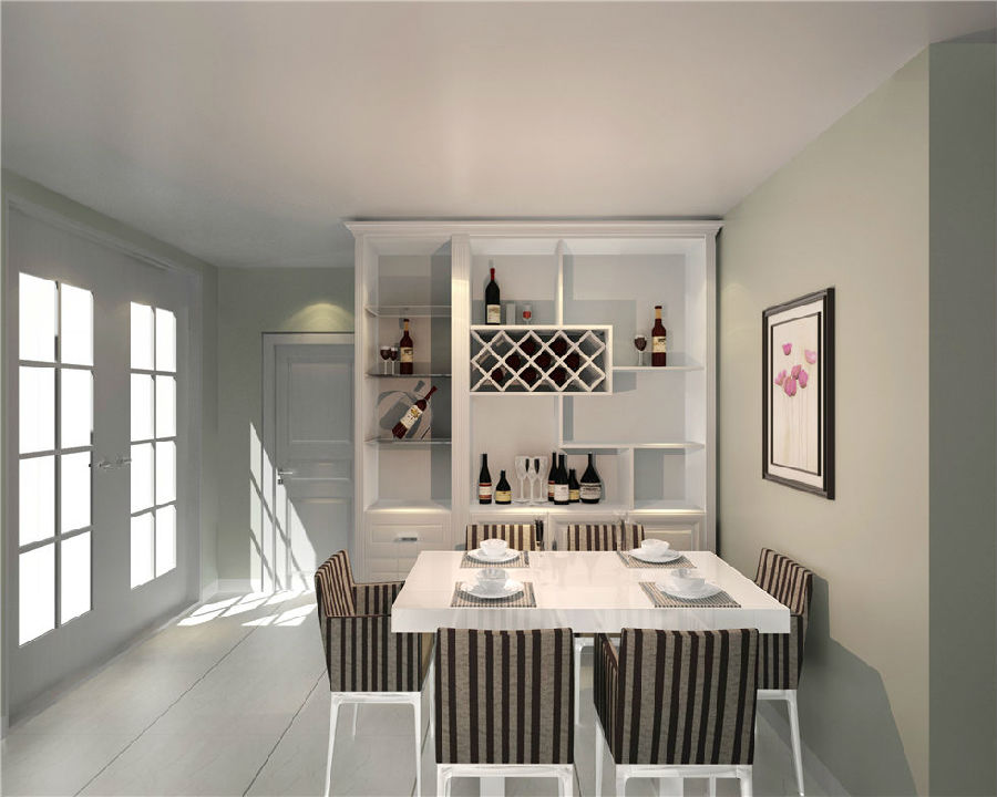 整體色彩采用純白色系,大面積的使用,使整體格局顯得十分整潔與開闊,空間十足,純白色的酒柜與整體風格相呼應(yīng),在收納面積增大的同時,也展現(xiàn)了收納的美學。