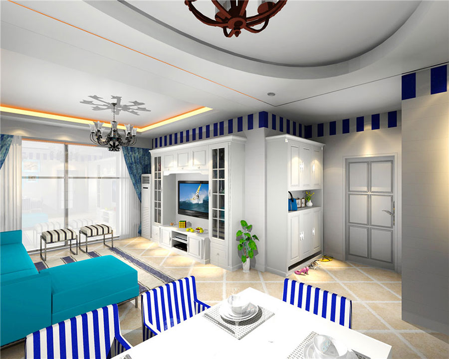 就整體布局來看,視覺上十分寬闊,顯得比較有格局。色彩搭配的話,純白色與深藍(lán)色的撞擊,不會顯得很突兀,反而給人一種眼前一亮的感覺。朱紅色與白色相間的吊燈造型,讓整體氛圍更加貼近自然。
